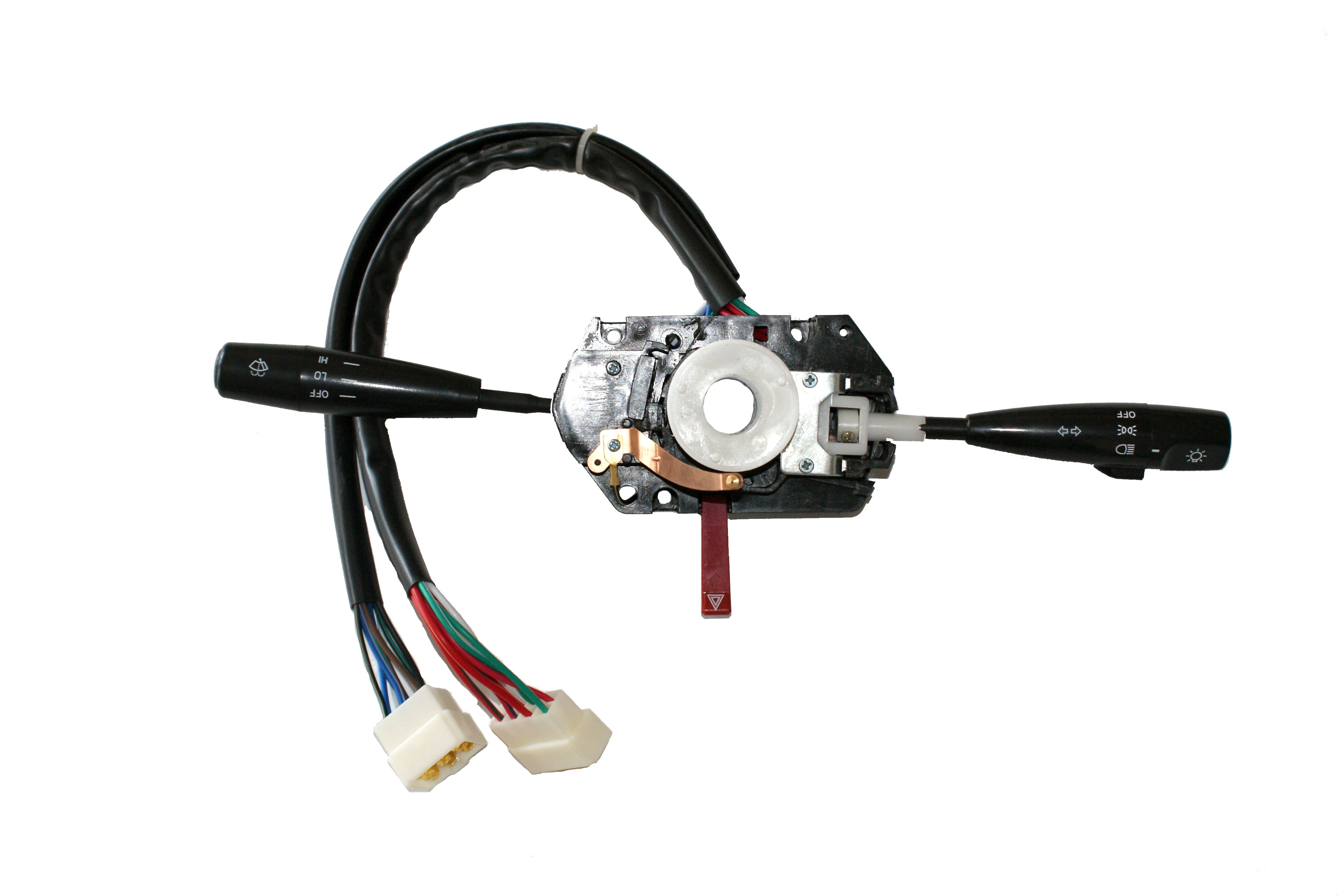 汽車組合開(kāi)關(guān)一個(gè)操作手柄控制雨刮和洗滌器開(kāi)關(guān),另一個(gè)操作手柄控制轉(zhuǎn)向燈、車燈和變光開(kāi)關(guān),另外一些汽車組合開(kāi)關(guān)還裝有喇叭開(kāi)關(guān)和多個(gè)備用開(kāi)關(guān),可以控制汽車上多種電器的通斷。
